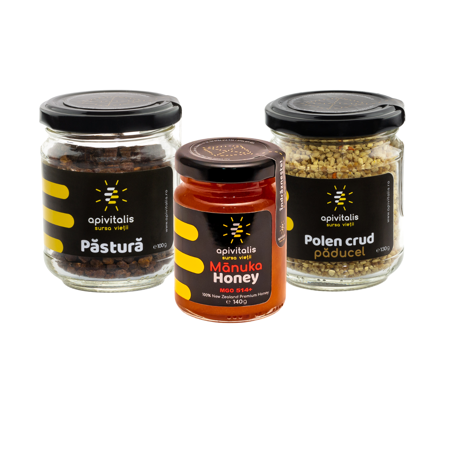 Pachetul conține: Păstură 100g x 1 buc Polen crud păducel 130g x 1 buc Miere Manuka MGO 514+ 140g x 1 buc